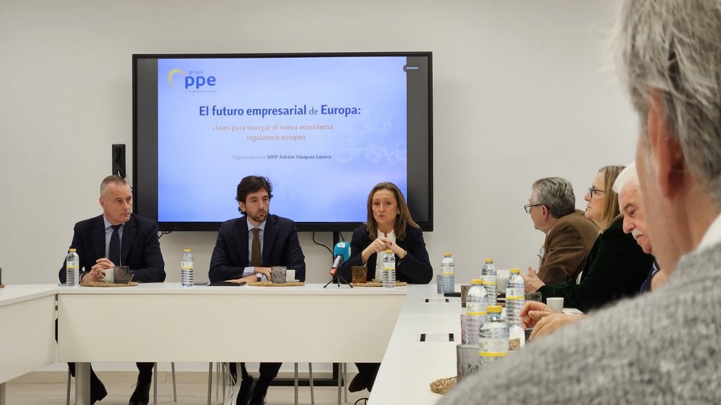 La presidenta del PP de Vigo, Luisa Sánchez, ha presentado este lunes al eurodiputado Adrián Vázquez Lázara, en un encuentro con empresarios celebrado en la Confederación de Empresarios de Pontevedra en el que el miembro del Parlamento Europeo ha dado las claves sobre la futura regulación que afectará al sector productivo. “Nos permite entender mejor qué cambios se avecinan, qué oportunidades se abren y cómo debemos posicionarnos desde Vigo, desde Galicia y desde España no solo para no quedarnos atrás, sino para liderar”, ha aseverado Luisa Sánchez.