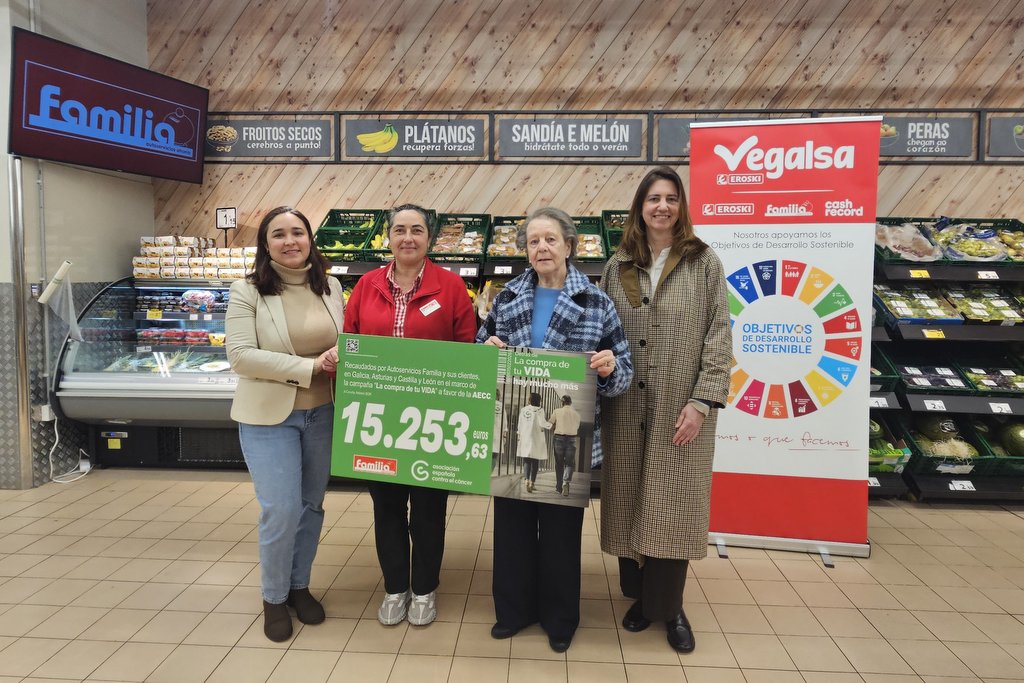 La compañía gallega de distribución alimentaria Vegalsa-Eroski y sus clientes han donado un total de 15.253,63 euros para la Asociación Española contra el Cáncer. El importe corresponde a lo recaudado a través de la campaña solidaria “La Compra de tu Vida”, que se llevó a cabo en los 79 establecimientos de la enseña Autoservicios Familia en Galicia, Asturias y Castilla y León entre el 6 y el 15 de febrero.