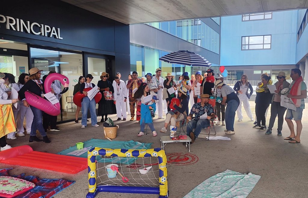 Un grupo de personas trabajadoras del Área Sanitaria de Vigo se movilizó hoy en el Álvaro Cunqueiro convocado por la Junta de Personal para rechazar las instrucciones de vacaciones restrictivas impuestas, un año más, por la Gerencia y denunciar precariedad en las contrataciones. Durante la protesta, que se celebró en la puerta principal del hospital al mediodía, se escenificó un día de playa con atuendo y objetos propio del período estival.